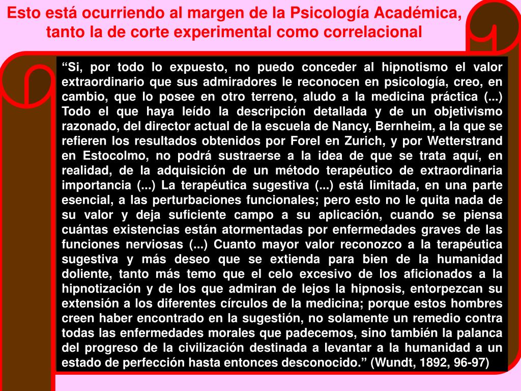 Esto está ocurriendo al margen de la Psicología Académica, tanto la de corte experimental como correlacional “Si, por todo lo expuesto, no puedo conceder al hipnotismo el valor extraordinario que sus admiradores le reconocen en psicología, creo, en cambio, que lo posee en otro terreno, aludo a la medicina práctica (...) Todo el que haya leído la descripción detallada y de un objetivismo razonado, del director actual de la escuela de Nancy, Bernheim, a la que se refieren los resultados obtenidos por Forel en Zurich, y por Wetterstrand en Estocolmo, no podrá sustraerse a la idea de que se trata aquí, en realidad, de la adquisición de un método terapéutico de extraordinaria importancia (...) La terapéutica sugestiva (...) está limitada, en una parte esencial, a las perturbaciones funcionales; pero esto no le quita nada de su valor y deja suficiente campo a su aplicación, cuando se piensa cuántas existencias están atormentadas por enfermedades graves de las funciones nerviosas (...) Cuanto mayor valor reconozco a la terapéutica sugestiva y más deseo que se extienda para bien de la humanidad doliente, tanto más temo que el celo excesivo de los aficionados a la hipnotización y de los que admiran de lejos la hipnosis, entorpezcan su extensión a los diferentes círculos de la medicina; porque estos hombres creen haber encontrado en la sugestión, no solamente un remedio contra todas las enfermedades morales que padecemos, sino también la palanca del progreso de la civilización destinada a levantar a la humanidad a un estado de perfección hasta entonces desconocido.” (Wundt, 1892, 96-97)