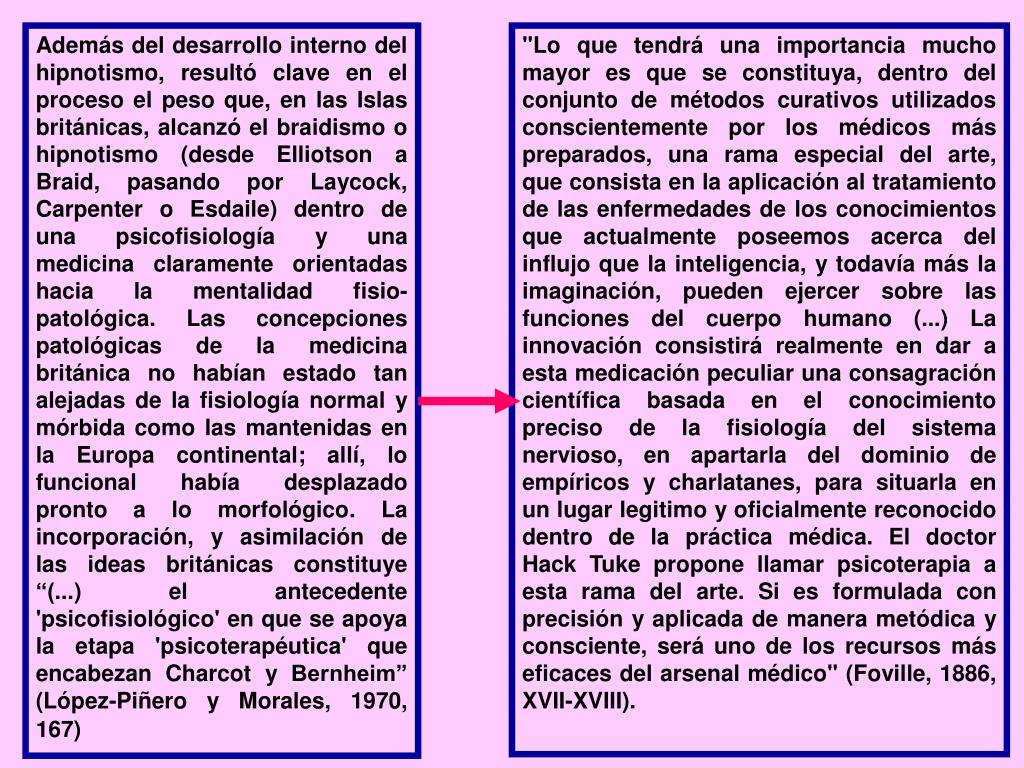Además del desarrollo interno del hipnotismo, resultó clave en el proceso el peso que, en las Islas británicas, alcanzó el braidismo o hipnotismo (desde Elliotson a Braid, pasando por Laycock, Carpenter o Esdaile) dentro de una psicofisiología y una medicina claramente orientadas hacia la mentalidad fisio-patológica. Las concepciones patológicas de la medicina británica no habían estado tan alejadas de la fisiología normal y mórbida como las mantenidas en la Europa continental; allí, lo funcional había desplazado pronto a lo morfológico. La incorporación, y asimilación de las ideas británicas constituye “(...) el antecedente 'psicofisiológico' en que se apoya la etapa 'psicoterapéutica' que encabezan Charcot y Bernheim” (López-Piñero y Morales, 1970, 167) "Lo que tendrá una importancia mucho mayor es que se constituya, dentro del conjunto de métodos curativos utilizados conscientemente por los médicos más preparados, una rama especial del arte, que consista en la aplicación al tratamiento de las enfermedades de los conocimientos que actualmente poseemos acerca del influjo que la inteligencia, y todavía más la imaginación, pueden ejercer sobre las funciones del cuerpo humano (...) La innovación consistirá realmente en dar a esta medicación peculiar una consagración científica basada en el conocimiento preciso de la fisiología del sistema nervioso, en apartarla del dominio de empíricos y charlatanes, para situarla en un lugar legitimo y oficialmente reconocido dentro de la práctica médica. El doctor Hack Tuke propone llamar psicoterapia a esta rama del arte. Si es formulada con precisión y aplicada de manera metódica y consciente, será uno de los recursos más eficaces del arsenal médico" (Foville, 1886, XVII-XVIII).
