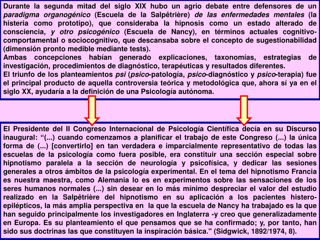 Durante la segunda mitad del siglo XIX hubo un agrio debate entre defensores de un paradigma organogénico (Escuela de la Salpêtrière) de las enfermedades mentales (la histeria como prototipo), que consideraba la hipnosis como un estado alterado de consciencia, y otro psicogénico (Escuela de Nancy), en términos actuales cognitivo-comportamental o sociocognitivo, que descansaba sobre el concepto de sugestionabilidad (dimensión pronto medible mediante tests). Ambas concepciones habían generado explicaciones, taxonomías, estrategias de investigación, procedimientos de diagnóstico, terapéuticas y resultados diferentes. El triunfo de los planteamientos psi (psico-patología, psico-diagnóstico y psico-terapia) fue el principal producto de aquella controversia teórica y metodológica que, ahora sí ya en el siglo XX, ayudaría a la definición de una Psicología autónoma. El Presidente del II Congreso Internacional de Psicología Científica decía en su Discurso inaugural: “(...) cuando comenzamos a planificar el trabajo de este Congreso (...) la única forma de (...) [convertirlo] en tan verdadera e imparcialmente representativo de todas las escuelas de la psicología como fuera posible, era constituir una sección especial sobre hipnotismo paralela a la sección de neurología y psicofísica, y dedicar las sesiones generales a otros ámbitos de la psicología experimental. En el tema del hipnotismo Francia es nuestra maestra, como Alemania lo es en experimentos sobre las sensaciones de los seres humanos normales (...) sin desear en lo más mínimo despreciar el valor del estudio realizado en la Salpêtrière del hipnotismo en su aplicación a los pacientes histero-epilépticos, la más amplia perspectiva en la que la escuela de Nancy ha trabajado es la que han seguido principalmente los investigadores en Inglaterra -y creo que generalizadamente en Europa. Es su planteamiento el que pensamos que se ha confirmado; y, por tanto, han sido sus doctrinas las que constituyen la inspiración básica." (Sidgwick, 1892/1974, 8).