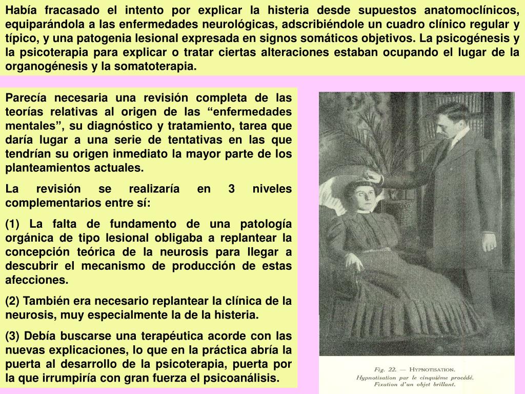 Había fracasado el intento por explicar la histeria desde supuestos anatomoclínicos, equiparándola a las enfermedades neurológicas, adscribiéndole un cuadro clínico regular y típico, y una patogenia lesional expresada en signos somáticos objetivos. La psicogénesis y la psicoterapia para explicar o tratar ciertas alteraciones estaban ocupando el lugar de la organogénesis y la somatoterapia. Parecía necesaria una revisión completa de las teorías relativas al origen de las “enfermedades mentales”, su diagnóstico y tratamiento, tarea que daría lugar a una serie de tentativas en las que tendrían su origen inmediato la mayor parte de los planteamientos actuales. La revisión se realizaría en 3 niveles complementarios entre sí: (1) La falta de fundamento de una patología orgánica de tipo lesional obligaba a replantear la concepción teórica de la neurosis para llegar a descubrir el mecanismo de producción de estas afecciones. (2) También era necesario replantear la clínica de la neurosis, muy especialmente la de la histeria. (3) Debía buscarse una terapéutica acorde con las nuevas explicaciones, lo que en la práctica abría la puerta al desarrollo de la psicoterapia, puerta por la que irrumpiría con gran fuerza el psicoanálisis.