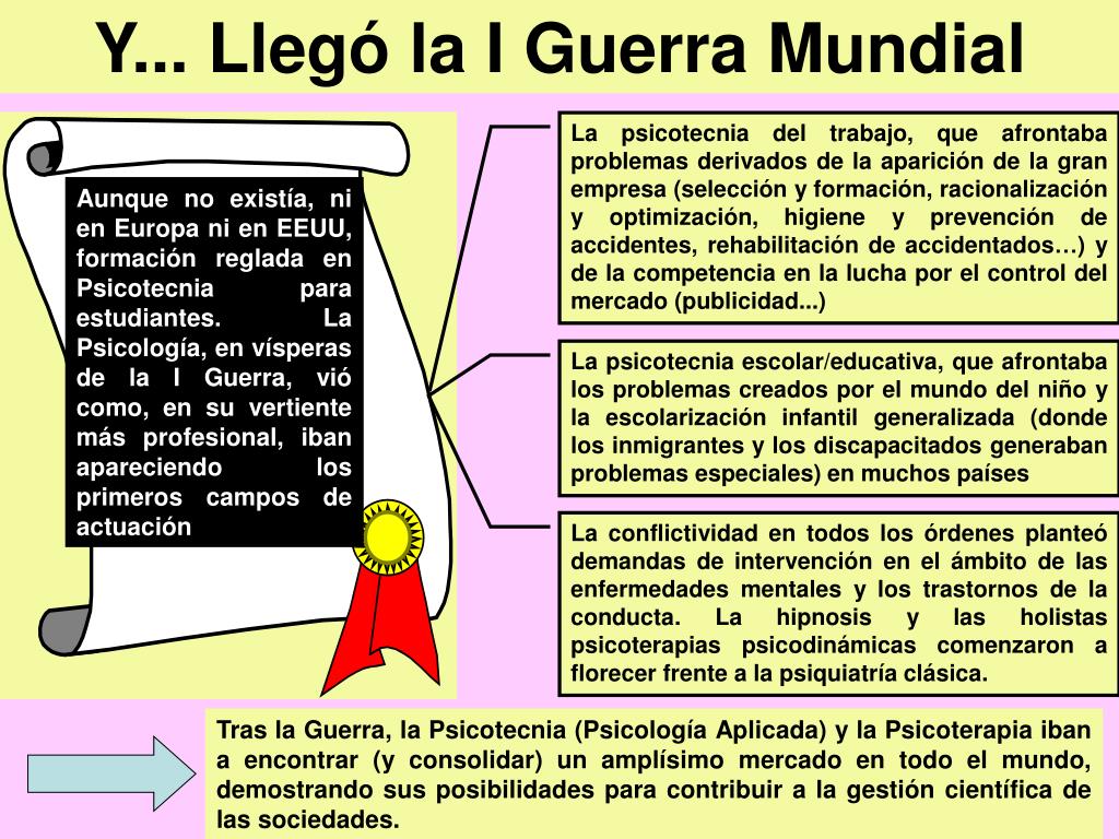 Y... Llegó la I Guerra Mundial La psicotecnia del trabajo, que afrontaba problemas derivados de la aparición de la gran empresa (selección y formación, racionalización y optimización, higiene y prevención de accidentes, rehabilitación de accidentados…) y de la competencia en la lucha por el control del mercado (publicidad...) Aunque no existía, ni en Europa ni en EEUU, formación reglada en Psicotecnia para estudiantes. La Psicología, en vísperas de la I Guerra, vió como, en su vertiente más profesional, iban apareciendo los primeros campos de actuación La psicotecnia escolar/educativa, que afrontaba los problemas creados por el mundo del niño y la escolarización infantil generalizada (donde los inmigrantes y los discapacitados generaban problemas especiales) en muchos países La conflictividad en todos los órdenes planteó demandas de intervención en el ámbito de las enfermedades mentales y los trastornos de la conducta. La hipnosis y las holistas psicoterapias psicodinámicas comenzaron a florecer frente a la psiquiatría clásica. Tras la Guerra, la Psicotecnia (Psicología Aplicada) y la Psicoterapia iban a encontrar (y consolidar) un amplísimo mercado en todo el mundo, demostrando sus posibilidades para contribuir a la gestión científica de las sociedades.