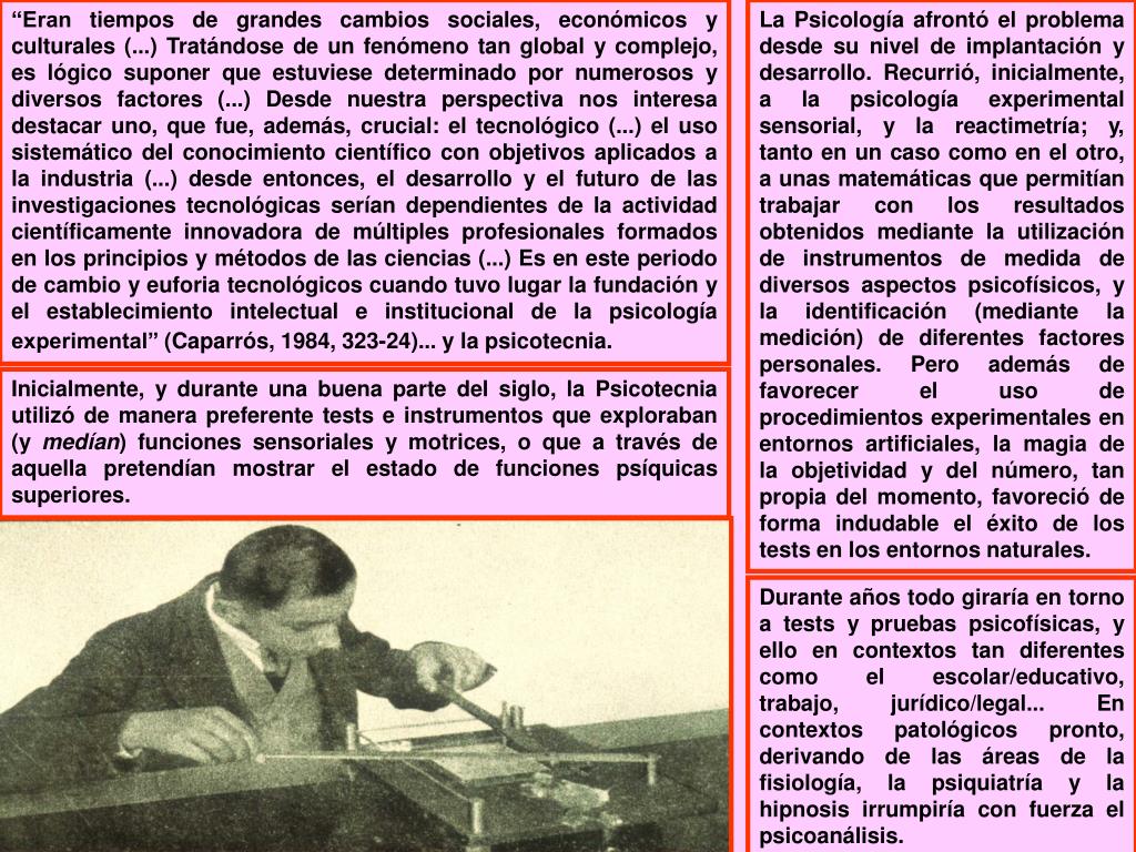 “Eran tiempos de grandes cambios sociales, económicos y culturales (...) Tratándose de un fenómeno tan global y complejo, es lógico suponer que estuviese determinado por numerosos y diversos factores (...) Desde nuestra perspectiva nos interesa destacar uno, que fue, además, crucial: el tecnológico (...) el uso sistemático del conocimiento científico con objetivos aplicados a la industria (...) desde entonces, el desarrollo y el futuro de las investigaciones tecnológicas serían dependientes de la actividad científicamente innovadora de múltiples profesionales formados en los principios y métodos de las ciencias (...) Es en este periodo de cambio y euforia tecnológicos cuando tuvo lugar la fundación y el establecimiento intelectual e institucional de la psicología experimental” (Caparrós, 1984, 323-24)... y la psicotecnia. La Psicología afrontó el problema desde su nivel de implantación y desarrollo. Recurrió, inicialmente, a la psicología experimental sensorial, y la reactimetría; y, tanto en un caso como en el otro, a unas matemáticas que permitían trabajar con los resultados obtenidos mediante la utilización de instrumentos de medida de diversos aspectos psicofísicos, y la identificación (mediante la medición) de diferentes factores personales. Pero además de favorecer el uso de procedimientos experimentales en entornos artificiales, la magia de la objetividad y del número, tan propia del momento, favoreció de forma indudable el éxito de los tests en los entornos naturales. Inicialmente, y durante una buena parte del siglo, la Psicotecnia utilizó de manera preferente tests e instrumentos que exploraban (y medían) funciones sensoriales y motrices, o que a través de aquella pretendían mostrar el estado de funciones psíquicas superiores. Durante años todo giraría en torno a tests y pruebas psicofísicas, y ello en contextos tan diferentes como el escolar/educativo, trabajo, jurídico/legal... En contextos patológicos pronto, derivando de las áreas de la fisiología, la psiquiatría y la hipnosis irrumpiría con fuerza el psicoanálisis.