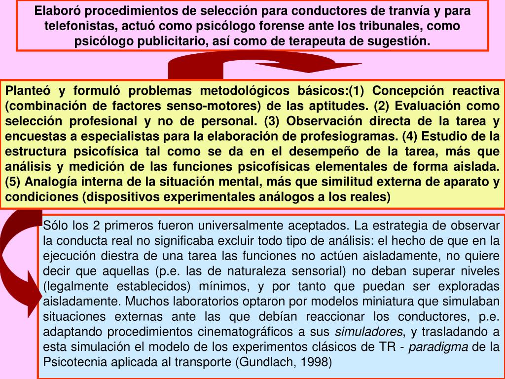 Elaboró procedimientos de selección para conductores de tranvía y para telefonistas, actuó como psicólogo forense ante los tribunales, como psicólogo publicitario, así como de terapeuta de sugestión. Planteó y formuló problemas metodológicos básicos:(1) Concepción reactiva (combinación de factores senso-motores) de las aptitudes. (2) Evaluación como selección profesional y no de personal. (3) Observación directa de la tarea y encuestas a especialistas para la elaboración de profesiogramas. (4) Estudio de la estructura psicofísica tal como se da en el desempeño de la tarea, más que análisis y medición de las funciones psicofísicas elementales de forma aislada. (5) Analogía interna de la situación mental, más que similitud externa de aparato y condiciones (dispositivos experimentales análogos a los reales) Sólo los 2 primeros fueron universalmente aceptados. La estrategia de observar la conducta real no significaba excluir todo tipo de análisis: el hecho de que en la ejecución diestra de una tarea las funciones no actúen aisladamente, no quiere decir que aquellas (p.e. las de naturaleza sensorial) no deban superar niveles (legalmente establecidos) mínimos, y por tanto que puedan ser exploradas aisladamente. Muchos laboratorios optaron por modelos miniatura que simulaban situaciones externas ante las que debían reaccionar los conductores, p.e. adaptando procedimientos cinematográficos a sus simuladores, y trasladando a esta simulación el modelo de los experimentos clásicos de TR - paradigma de la Psicotecnia aplicada al transporte (Gundlach, 1998)