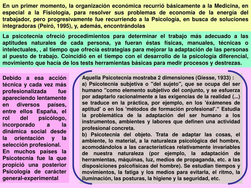 En un primer momento, la organización económica recurrió básicamente a la Medicina, en especial a la Fisiología, para resolver sus problemas de economía de la energía del trabajador, pero progresivamente fue recurriendo a la Psicología, en busca de soluciones integradoras (Peiró, 1995), y, además, encontrándolas La psicotecnia ofreció procedimientos para determinar el trabajo más adecuado a las aptitudes naturales de cada persona, ya fueran éstas físicas, manuales, técnicas o intelectuales, , al tiempo que ofrecía estrategias para mejorar la adaptación de las personas al puesto de trabajo. Coincidió en el tiempo con el desarrollo de la psicología diferencial, movimiento que hacía de los tests herramientas básicas para medir procesos y destrezas. Debido a esa acción técnica y cada vez más profesionalizada fue apareciendo lentamente en diversos países, entre ellos España, el rol del psicólogo, incorporado a la dinámica social desde la orientación y la selección profesional. En muchos países la Psicotecnia fue la que propició una posterior Psicología de carácter general-experimental Aquella Psicotecnia mostraba 2 dimensiones (Giesse, 1933) : a) Psicotecnia subjetiva o "del sujeto", que se ocupa del ser humano "como elemento subjetivo del conjunto, y se esfuerza por adaptarlo racionalmente a las exigencias de la realidad (...) se traduce en la práctica, por ejemplo, en los 'éxámenes de aptitud' o en los 'métodos de formación profesional'.” Estudia la problemática de la adaptación del ser humano a los instrumentos, ambientes y labores que definen una actividad profesional concreta. b) Psicotecnia del objeto. Trata de adaptar las cosas, el ambiente, lo material, a la naturaleza psicológica del hombre, acomodándolos a las características relativamente invariables de nuestra naturaleza (por ejemplo, la adaptación de herramientas, máquinas, luz, medios de propaganda, etc. a las disposiciones psicofísicas del hombre). Se estudian tiempos y movimientos, la fatiga y los medios para evitarla, el ritmo, la iluminación, las posturas, la higiene y la seguridad, etc.
