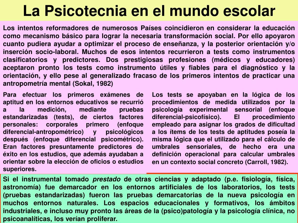 La Psicotecnia en el mundo escolar Los intentos reformadores de numerosos Países coincidieron en considerar la educación como mecanismo básico para lograr la necesaria transformación social. Por ello apoyaron cuanto pudiera ayudar a optimizar el proceso de enseñanza, y la posterior orientación y/o inserción socio-laboral. Muchos de esos intentos recurrieron a tests como instrumentos clasificatorios y predictores. Dos prestigiosas profesiones (médicos y educadores) aceptaron pronto los tests como instrumento útiles y fiables para el diagnóstico y la orientación, y ello pese al generalizado fracaso de los primeros intentos de practicar una antropometría mental (Sokal, 1982) Para efectuar los primeros exámenes de aptitud en los entornos educativos se recurrió a la medición, mediante pruebas estandarizadas (tests), de ciertos factores personales: corporales primero (enfoque diferencial-antropométrico) y psicológicos después (enfoque diferencial psicométrico). Eran factores presuntamente predictores de éxito en los estudios, que además ayudaban a orientar sobre la elección de oficios o estudios superiores. Los tests se apoyaban en la lógica de los procedimientos de medida utilizados por la psicología experimental sensorial (enfoque diferencial-psicofísico). El procedimiento empleado para asignar los grados de dificultad a los ítems de los tests de aptitudes poseía la misma lógica que el utilizado para el cálculo de umbrales sensoriales, de hecho era una definición operacional para calcular umbrales en un contexto social concreto (Carroll, 1982). Si el instrumental tomado prestado de otras ciencias y adaptado (p.e. fisiología, física, astronomía) fue demarcador en los entornos artificiales de los laboratorios, los tests (pruebas estandarizadas) fueron las pruebas demarcatorias de la nueva psicología en muchos entornos naturales. Los espacios educacionales y formativos, los ámbitos industriales, e incluso muy pronto las áreas de la (psico)patología y la psicología clínica, no psicoanalíticas, los verían proliferar.