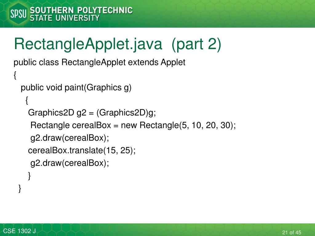 File RectangleApplet.java // Construct a rectangle and draw it Rectangle box = new Rectangle(5, 10, 20, 30); g2.draw(box); // Move rectangle 15 units to the right and // 25 units down box.translate(15, 25); // Draw moved rectangle g2.draw(box); } }