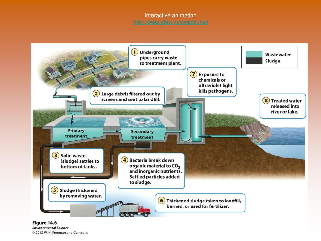 Treatments for Human and Animal Wastewater • Sewage Treatment Plants- centralized plants in areas with large populations that receive wastewater via a network of underground pipes.