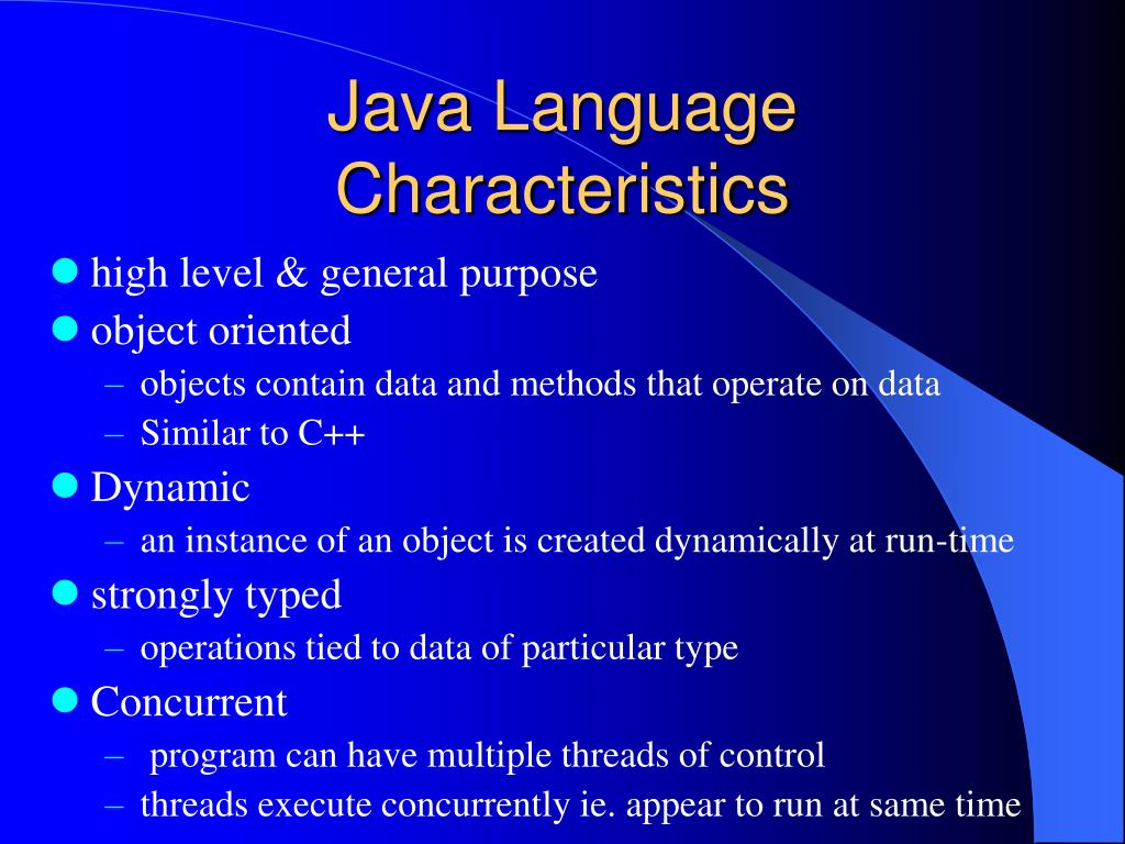 Java Language Characteristics • high level & general purpose • object oriented • objects contain data and methods that operate on data • Similar to C++ • Dynamic • an instance of an object is created dynamically at run-time • strongly typed • operations tied to data of particular type • Concurrent • program can have multiple threads of control • threads execute concurrently ie. appear to run at same time