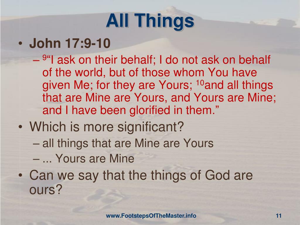 All Things • John 17:9-10 • 9“I ask on their behalf; I do not ask on behalf of the world, but of those whom You have given Me; for they are Yours; 10and all things that are Mine are Yours, and Yours are Mine; and I have been glorified in them.” • Which is more significant? • all things that are Mine are Yours • ... Yours are Mine • Can we say that the things of God are ours? www.FootstepsOfTheMaster.info