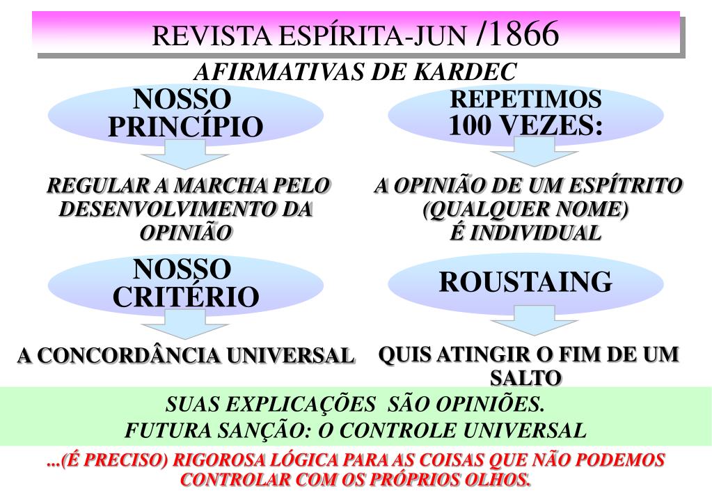 REVISTA ESPÍRITA-JUN /1866 AFIRMATIVAS DE KARDEC NOSSO PRINCÍPIO REPETIMOS 100 VEZES: REGULAR A MARCHA PELO DESENVOLVIMENTO DA OPINIÃO A OPINIÃO DE UM ESPÍTRITO (QUALQUER NOME) É INDIVIDUAL ROUSTAING NOSSO CRITÉRIO QUIS ATINGIR O FIM DE UM SALTO A CONCORDÂNCIA UNIVERSAL SUAS EXPLICAÇÕES SÃO OPINIÕES. FUTURA SANÇÃO: O CONTROLE UNIVERSAL ...(É PRECISO) RIGOROSA LÓGICA PARA AS COISAS QUE NÃO PODEMOS CONTROLAR COM OS PRÓPRIOS OLHOS.