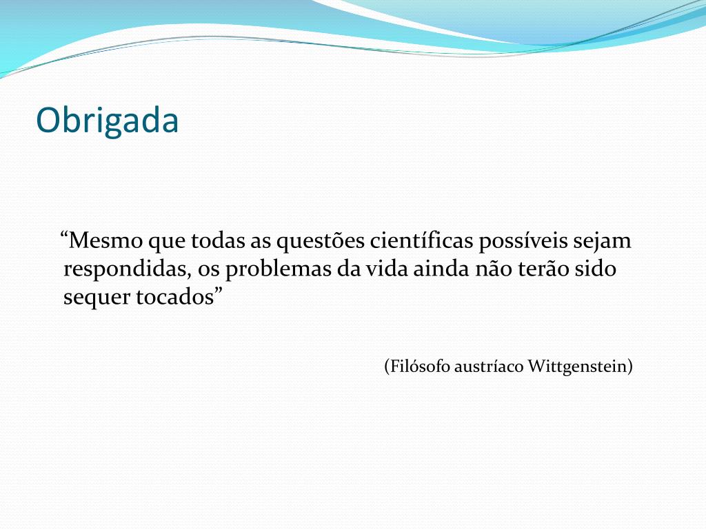 Obrigada “Mesmo que todas as questões científicas possíveis sejam respondidas, os problemas da vida ainda não terão sido sequer tocados” (Filósofo austríaco Wittgenstein)