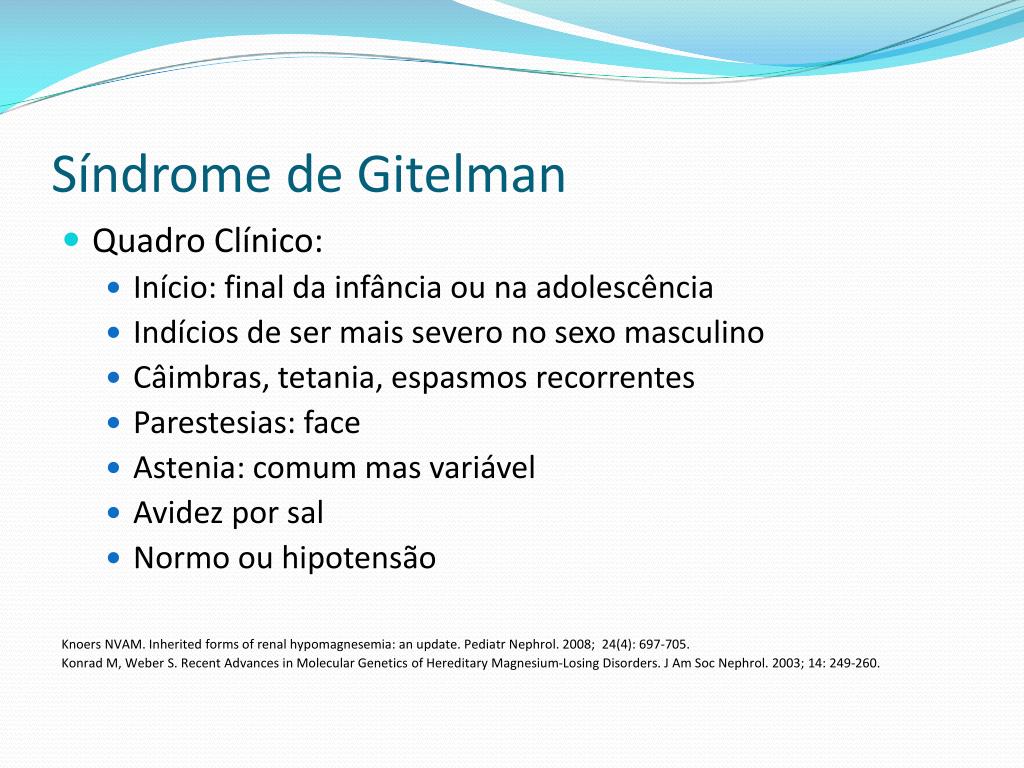 Síndrome de Gitelman • Quadro Clínico: • Início: final da infância ou na adolescência • Indícios de ser mais severo no sexo masculino • Câimbras, tetania, espasmos recorrentes • Parestesias: face • Astenia: comum mas variável • Avidez por sal • Normoouhipotensão Knoers NVAM. Inherited forms of renal hypomagnesemia: an update. PediatrNephrol. 2008; 24(4): 697-705. Konrad M, Weber S. Recent Advances in Molecular Genetics of Hereditary Magnesium-Losing Disorders. J Am Soc Nephrol. 2003; 14: 249-260.