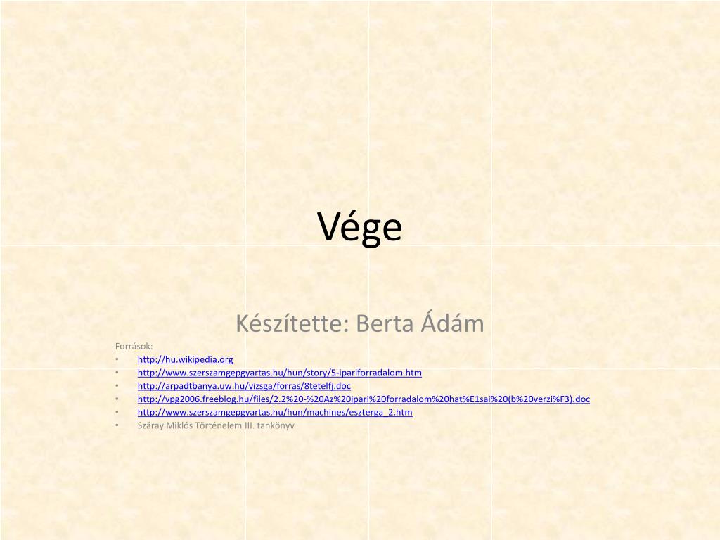 Vége Készítette: Berta Ádám Források: http://hu.wikipedia.org http://www.szerszamgepgyartas.hu/hun/story/5-ipariforradalom.htm http://arpadtbanya.uw.hu/vizsga/forras/8tetelfj.doc http://vpg2006.freeblog.hu/files/2.2%20-%20Az%20ipari%20forradalom%20hat%E1sai%20(b%20verzi%F3).doc http://www.szerszamgepgyartas.hu/hun/machines/eszterga_2.htm Száray Miklós Történelem III. tankönyv