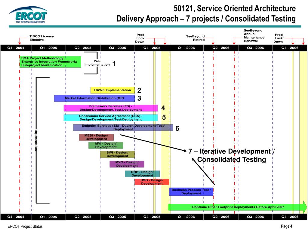 PR-50121 Service Oriented Architecture Additional Information • Bus Lead: Each sub project has a lead • Richard Gruber / Jim Galvin are Director level support • PPL: Source: ERCOT Priority: 1.1 Rank: 17 Program Area: RO • What prompted the project: • CASUP identified EAI as a major challenge for ERCOT • PR-40066_06 was initiated to evaluate EAI vendors, and to make a recommendation on how ERCOT should implement its future EAI strategy. ERCOT worked with three short listed vendors to install their products in a lab environment and performed a set of reliability, performance, manageability and productivity tests. The tests resulted in a recommendation to replace SeeBeyond with the TIBCO EAI product. • The Board approved the recommendation and funding in October 2004. The SOA project will be delivered in a series of sub-projects throughout 2005, 2006 and into 2007.