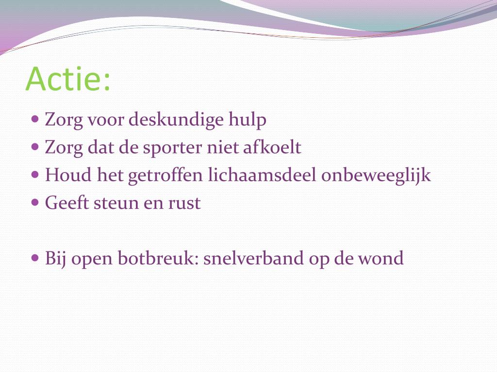 Actie: • Zorg voor deskundige hulp • Zorg dat de sporter niet afkoelt • Houd het getroffen lichaamsdeel onbeweeglijk • Geeft steun en rust • Bij open botbreuk: snelverband op de wond