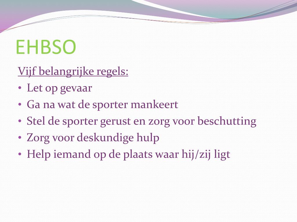 EHBSO Vijf belangrijke regels: • Let op gevaar • Ga na wat de sporter mankeert • Stel de sporter gerust en zorg voor beschutting • Zorg voor deskundige hulp • Help iemand op de plaats waar hij/zij ligt