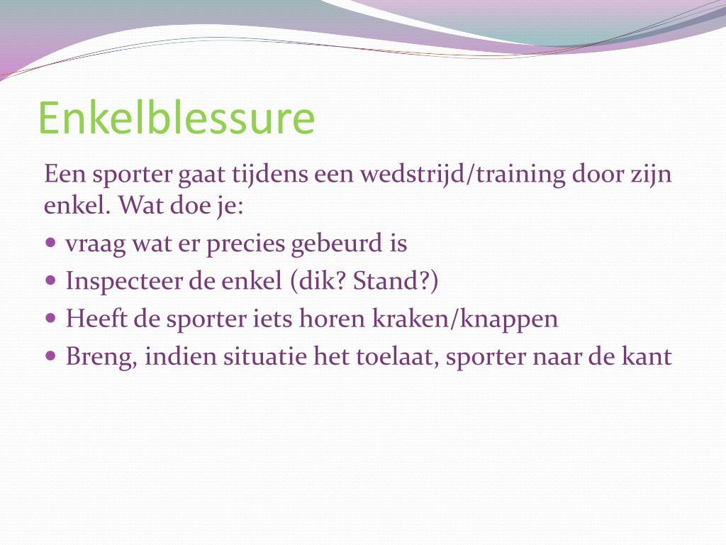 Enkelblessure Een sporter gaat tijdens een wedstrijd/training door zijn enkel. Wat doe je: • vraag wat er precies gebeurd is • Inspecteer de enkel (dik? Stand?) • Heeft de sporter iets horen kraken/knappen • Breng, indien situatie het toelaat, sporter naar de kant