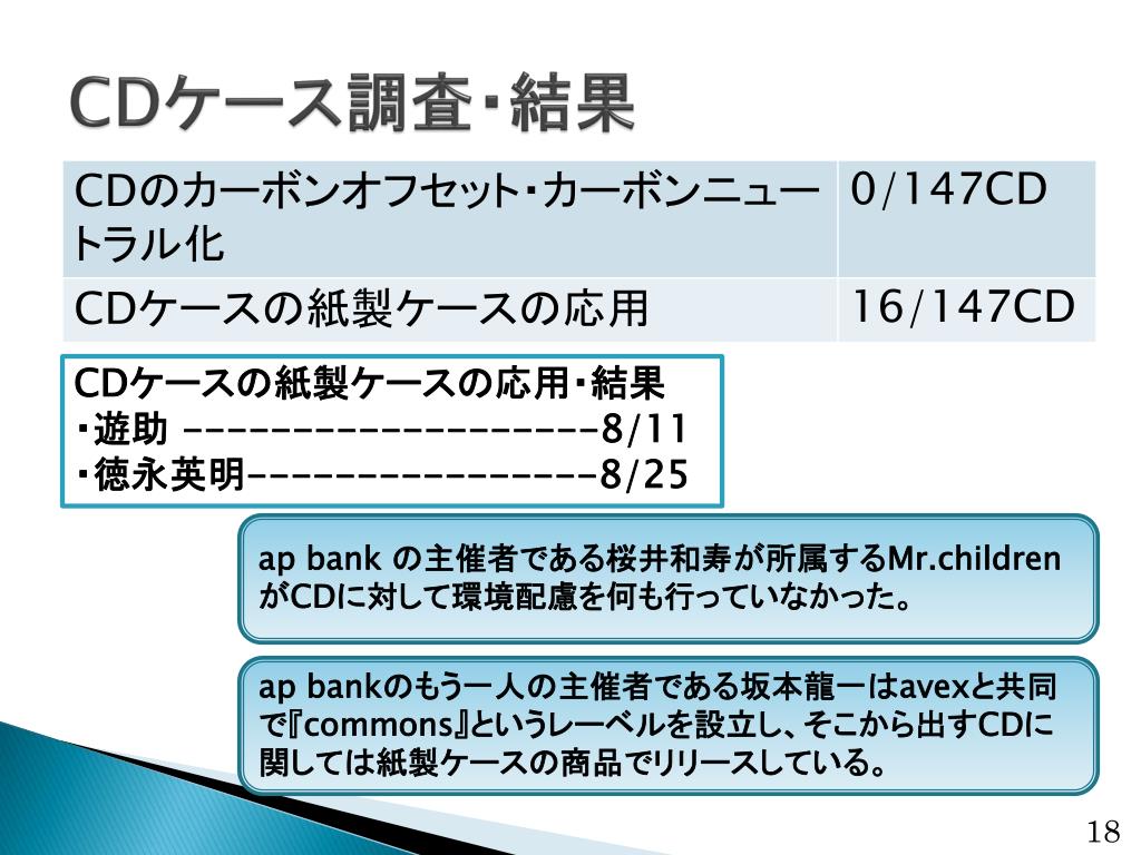 CDケース調査・結果 CDケースの紙製ケースの応用・結果 ・遊助 -------------------8/11 ・徳永英明----------------8/25 ap bank の主催者である桜井和寿が所属するMr.childrenがCDに対して環境配慮を何も行っていなかった。 ap bankのもう一人の主催者である坂本龍一はavexと共同で『commons』というレーベルを設立し、そこから出すCDに関しては紙製ケースの商品でリリースしている。 18