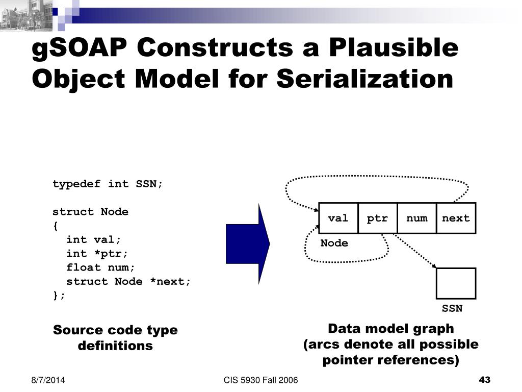 gSOAP Constructs a Plausible Object Model for Serialization typedef int SSN;struct Node{ int val; int *ptr; float num; struct Node *next;}; val ptr num next Node SSN Data model graph(arcs denote all possiblepointer references) Source code typedefinitions CIS 5930 Fall 2006