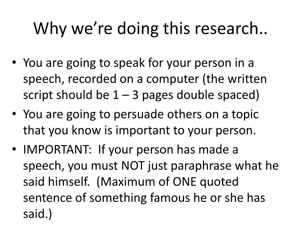 Why we’re doing this research.. • You are going to speak for your person in a speech, recorded on a computer (the written script should be 1 – 3 pages double spaced) • You are going to persuade others on a topic that you know is important to your person. • IMPORTANT: If your person has made a speech, you must NOT just paraphrase what he said himself. (Maximum of ONE quoted sentence of something famous he or she has said.)