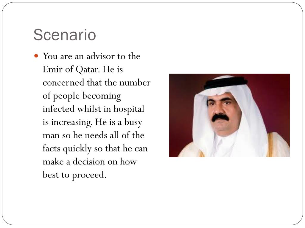 Scenario • You are an advisor to the Emir of Qatar. He is concerned that the number of people becoming infected whilst in hospital is increasing. He is a busy man so he needs all of the facts quickly so that he can make a decision on how best to proceed.