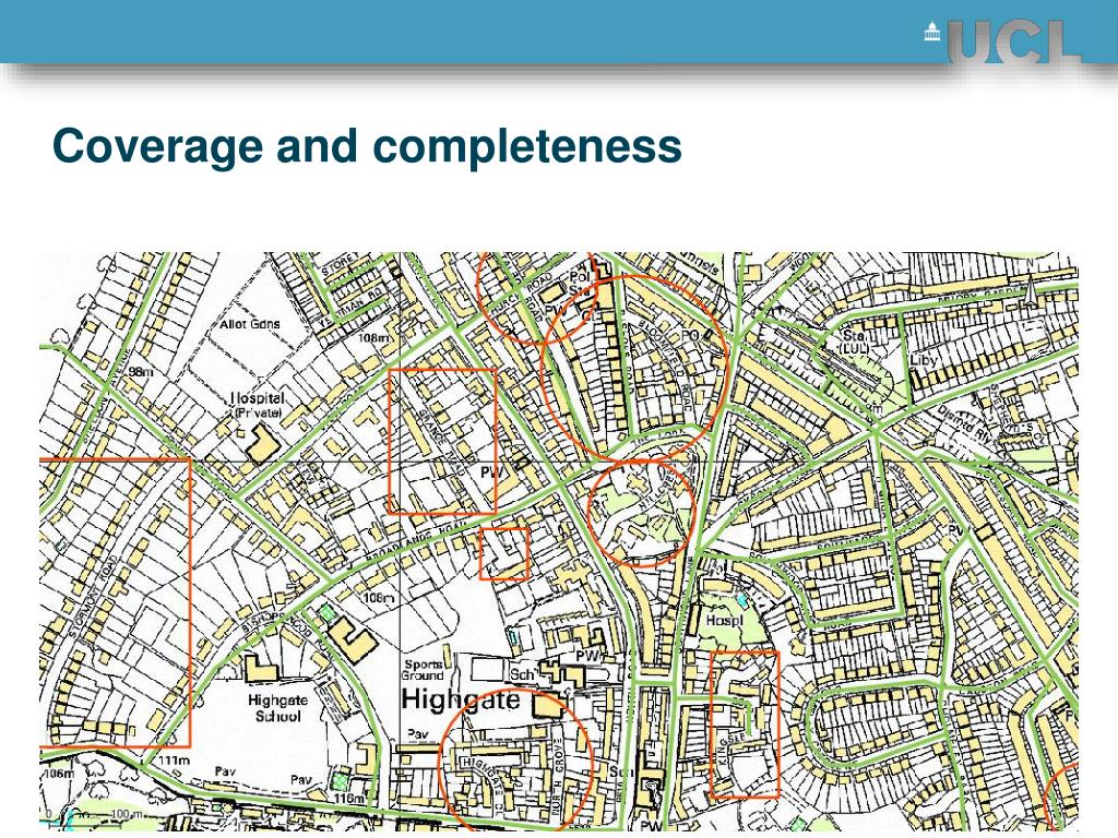 Completeness with attributes • The test for completeness with attributes checks that roads and streets names have been completed • Until the release of Ordnance Survey data in 1st April 2010, this was a good indication for ground survey of an area