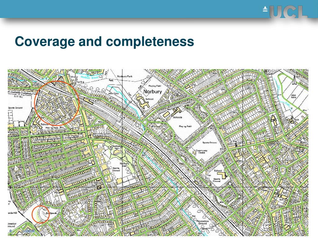 Accuracy and Completeness- Study I • Comparing OSM to OS Meridian 2 roads layer • Maridian 2 -Motorways, major and minor roads are... Complex junctions are collapsed to single nodes and multi-carriageways to single links... some minor roads and cul-de-sacs less than 200m are not represented... Private roads and tracks are not included... • Nodes are derived from 1:1,250-1:2,500 mapping, with 20m filter around centre line generalisation