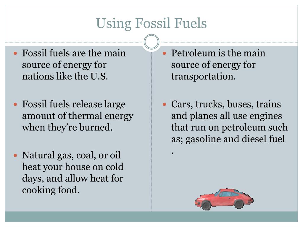 Using Fossil Fuels Fossil fuels are the main source of energy for nations like the U.S. Fossil fuels release large amount of thermal energy when they’re burned. Natural gas, coal, or oil heat your house on cold days, and allow heat for cooking food. Petroleum is the main source of energy for transportation. Cars, trucks, buses, trains and planes all use engines that run on petroleum such as; gasoline and diesel fuel .