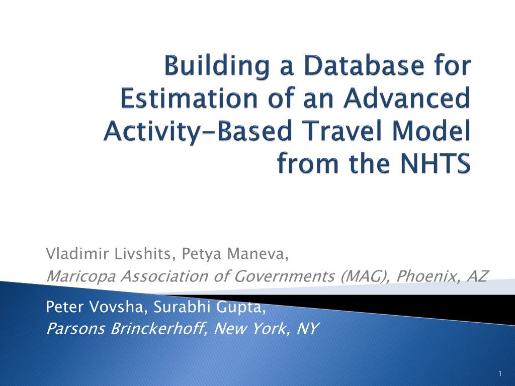 Building a Database for Estimation of an Advanced Activity-Based Travel Model from the NHTS Vladimir Livshits, Petya Maneva, Maricopa Association of Governments (MAG), Phoenix, AZ Peter Vovsha, Surabhi Gupta, Parsons Brinckerhoff, New York, NY