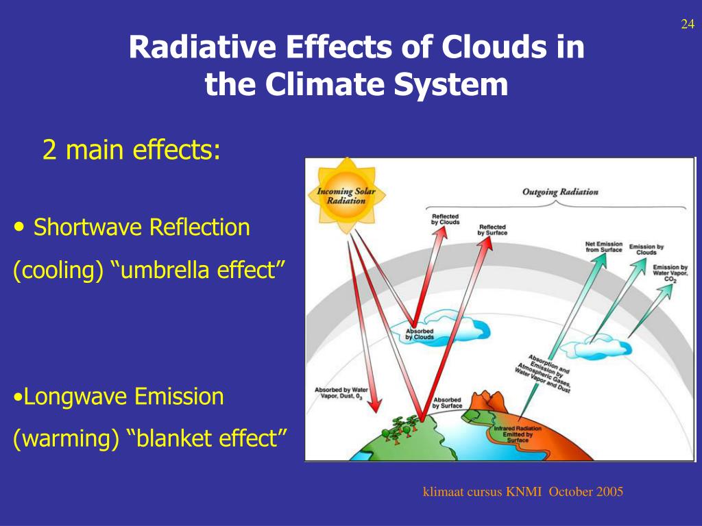 Radiative Effects of Clouds in the Climate System 2 main effects: • Shortwave Reflection (cooling) “umbrella effect” • Longwave Emission (warming) “blanket effect” klimaat cursus KNMI October 2005