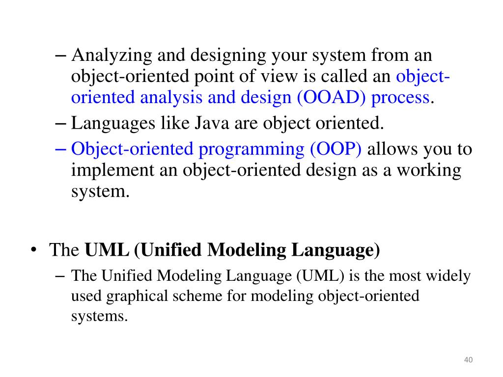 Analyzing and designing your system from an object-oriented point of view is called an object-oriented analysis and design (OOAD) process. • Languages like Java are object oriented. • Object-oriented programming (OOP) allows you to implement an object-oriented design as a working system. • The UML (Unified Modeling Language) • The Unified Modeling Language (UML) is the most widely used graphical scheme for modeling object-oriented systems.