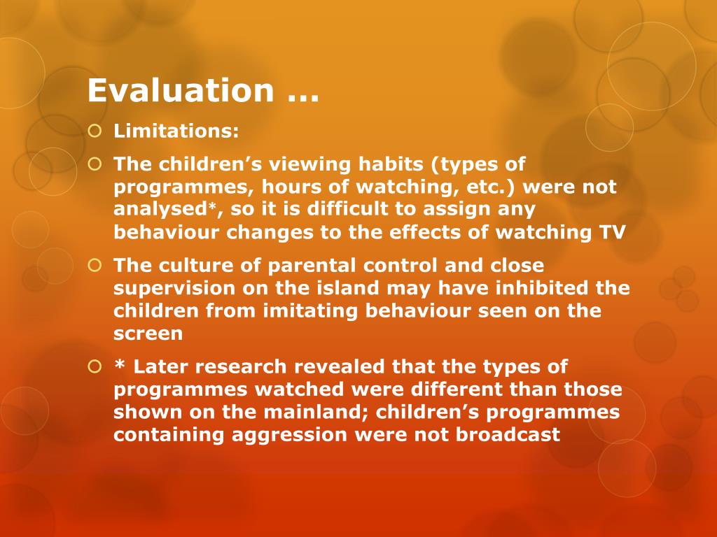 Evaluation ... • Limitations: • The children’s viewing habits (types of programmes, hours of watching, etc.) were not analysed*, so it is difficult to assign any behaviour changes to the effects of watching TV • The culture of parental control and close supervision on the island may have inhibited the children from imitating behaviour seen on the screen • * Later research revealed that the types of programmes watched were different than those shown on the mainland; children’s programmes containing aggression were not broadcast