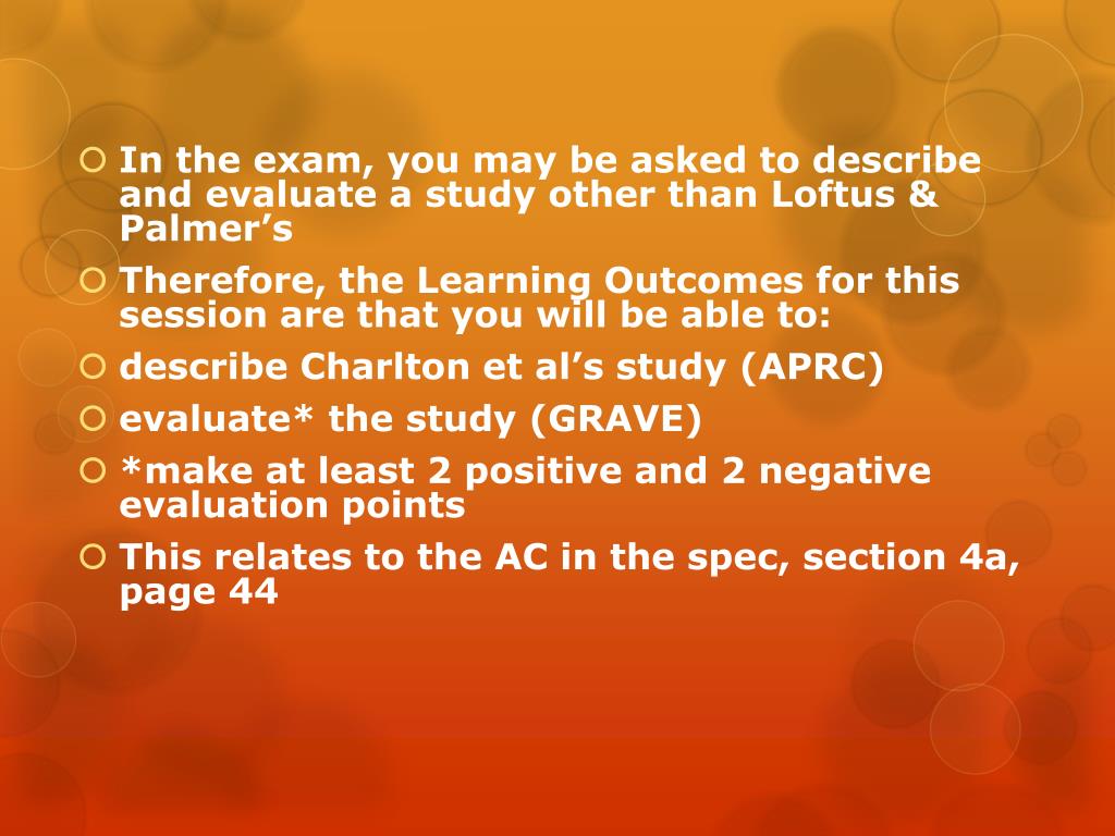 In the exam, you may be asked to describe and evaluate a study other than Loftus & Palmer’s • Therefore, the Learning Outcomes for this session are that you will be able to: • describe Charlton et al’s study (APRC) • evaluate* the study (GRAVE) • *make at least 2 positive and 2 negative evaluation points • This relates to the AC in the spec, section 4a, page 44