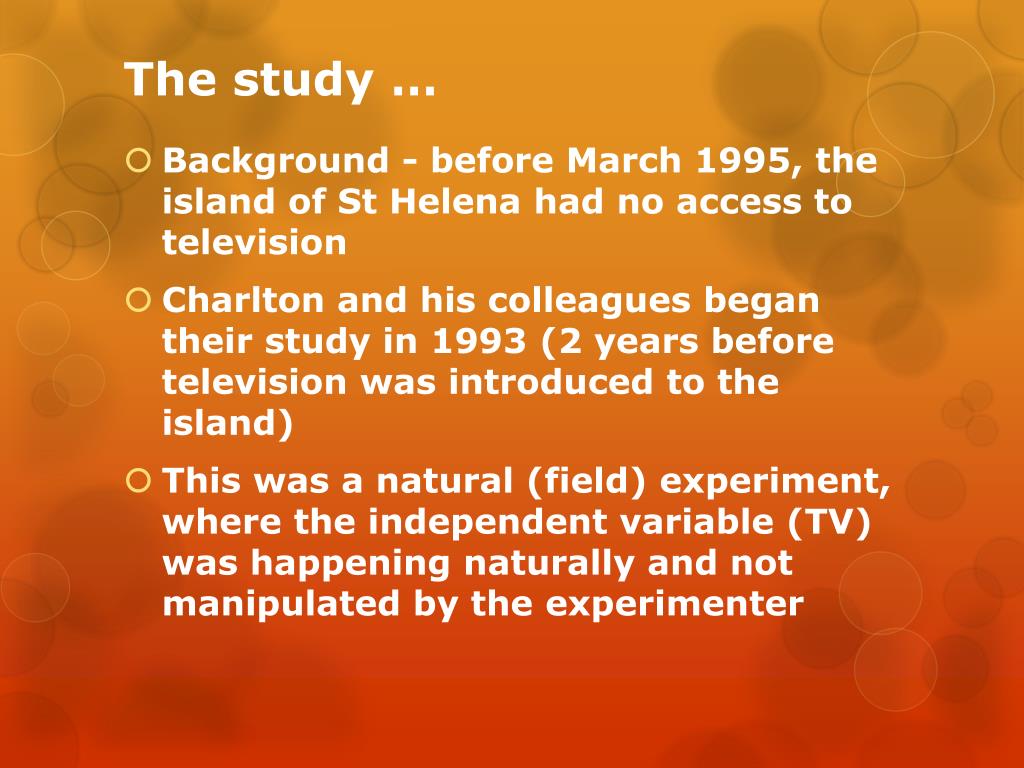 The study … • Background - before March 1995, the island of St Helena had no access to television • Charlton and his colleagues began their study in 1993 (2 years before television was introduced to the island) • This was a natural (field) experiment, where the independent variable (TV) was happening naturally and not manipulated by the experimenter