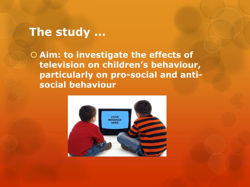 The study … • Aim: to investigate the effects of television on children’s behaviour, particularly on pro-social and anti-social behaviour