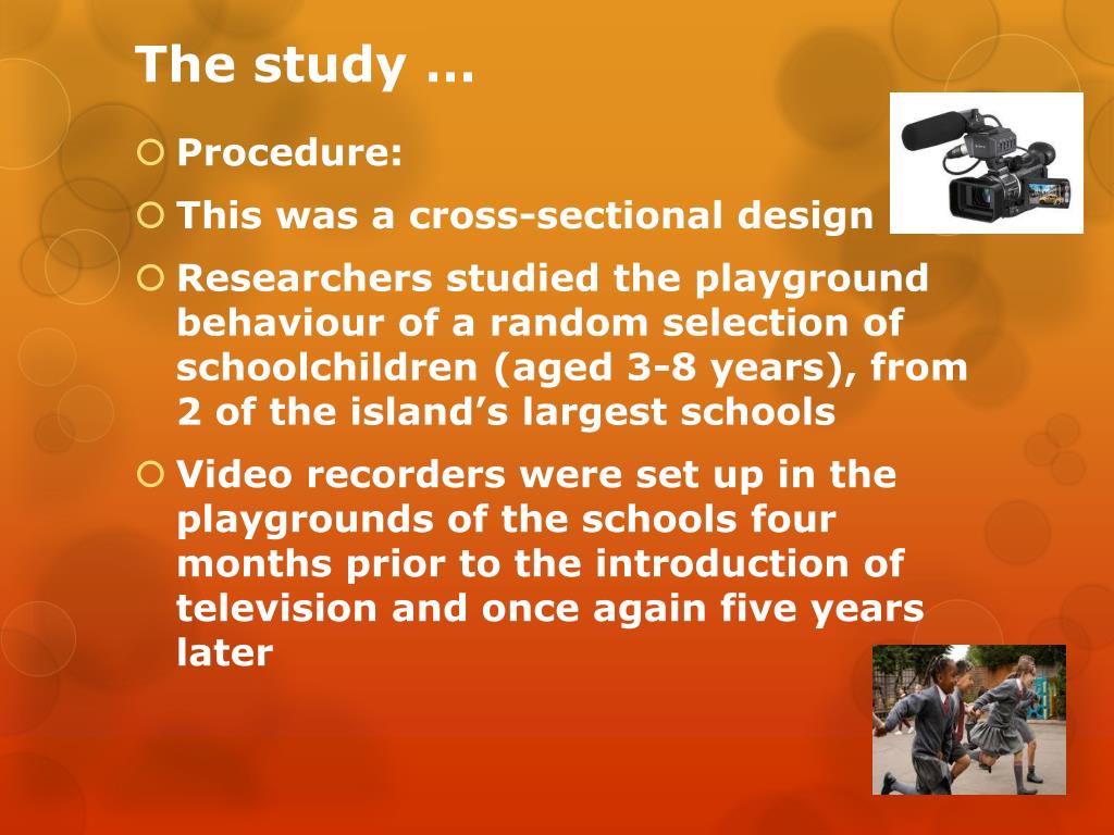 The study … • Procedure: • This was a cross-sectional design • Researchers studied the playground behaviour of a random selection of schoolchildren (aged 3-8 years), from 2 of the island’s largest schools • Video recorders were set up in the playgrounds of the schools four months prior to the introduction of television and once again five years later