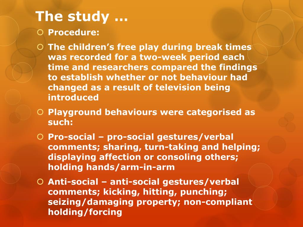 The study … • Procedure: • The children’s free play during break times was recorded for a two-week period each time and researchers compared the findings to establish whether or not behaviour had changed as a result of television being introduced • Playground behaviours were categorised as such: • Pro-social – pro-social gestures/verbal comments; sharing, turn-taking and helping; displaying affection or consoling others; holding hands/arm-in-arm • Anti-social – anti-social gestures/verbal comments; kicking, hitting, punching; seizing/damaging property; non-compliant holding/forcing
