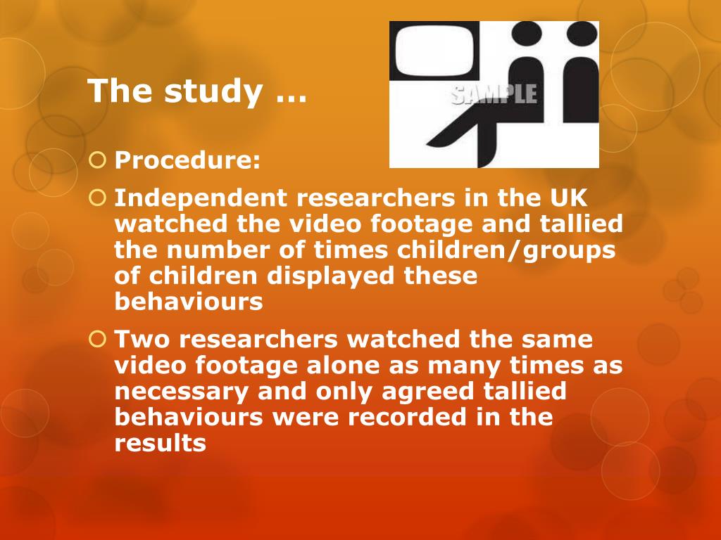 The study … • Procedure: • Independent researchers in the UK watched the video footage and tallied the number of times children/groups of children displayed these behaviours • Two researchers watched the same video footage alone as many times as necessary and only agreed tallied behaviours were recorded in the results
