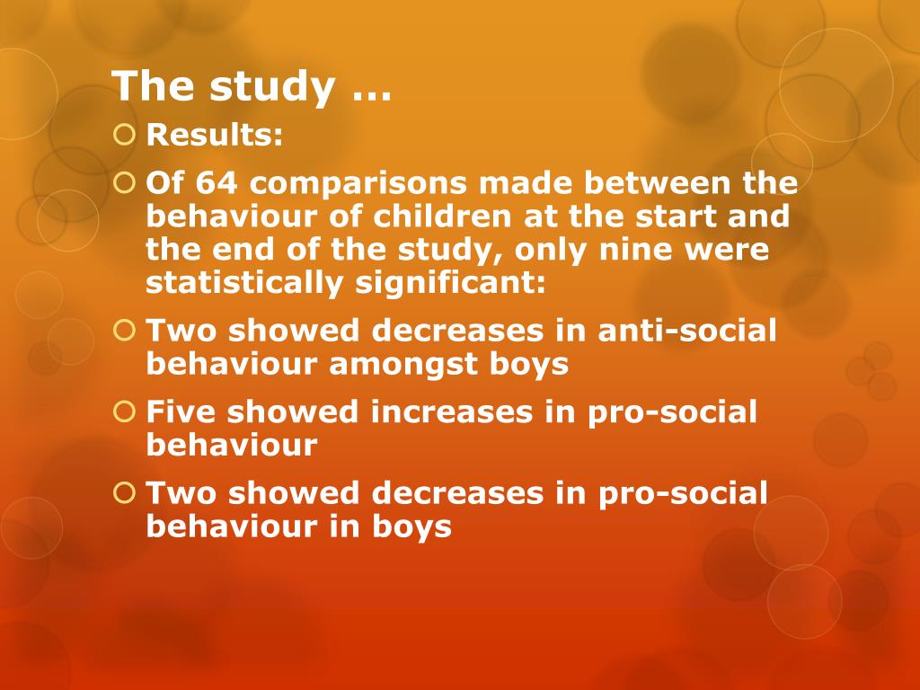 The study … • Results: • Of 64 comparisons made between the behaviour of children at the start and the end of the study, only nine were statistically significant: • Two showed decreases in anti-social behaviour amongst boys • Five showed increases in pro-social behaviour • Two showed decreases in pro-social behaviour in boys