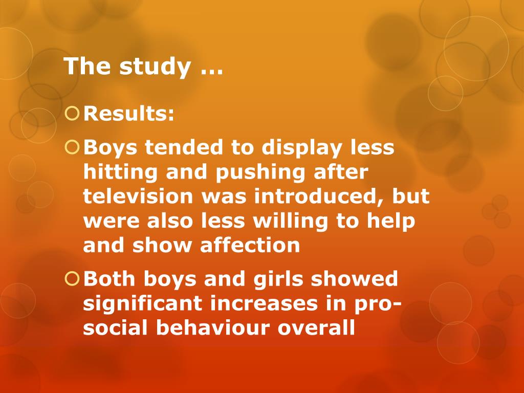 The study … • Results: • Boys tended to display less hitting and pushing after television was introduced, but were also less willing to help and show affection • Both boys and girls showed significant increases in pro-social behaviour overall