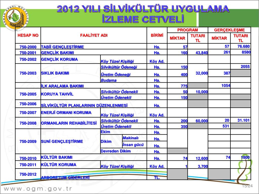 2012 YILI TABİİ GENÇLEŞTİRME DURUMU 2012 YILI TABİİ GENÇLEŞTİRME ÇALIŞMALARI TAKİP CETVELİ 31.12.2012 tarihi itibariyle