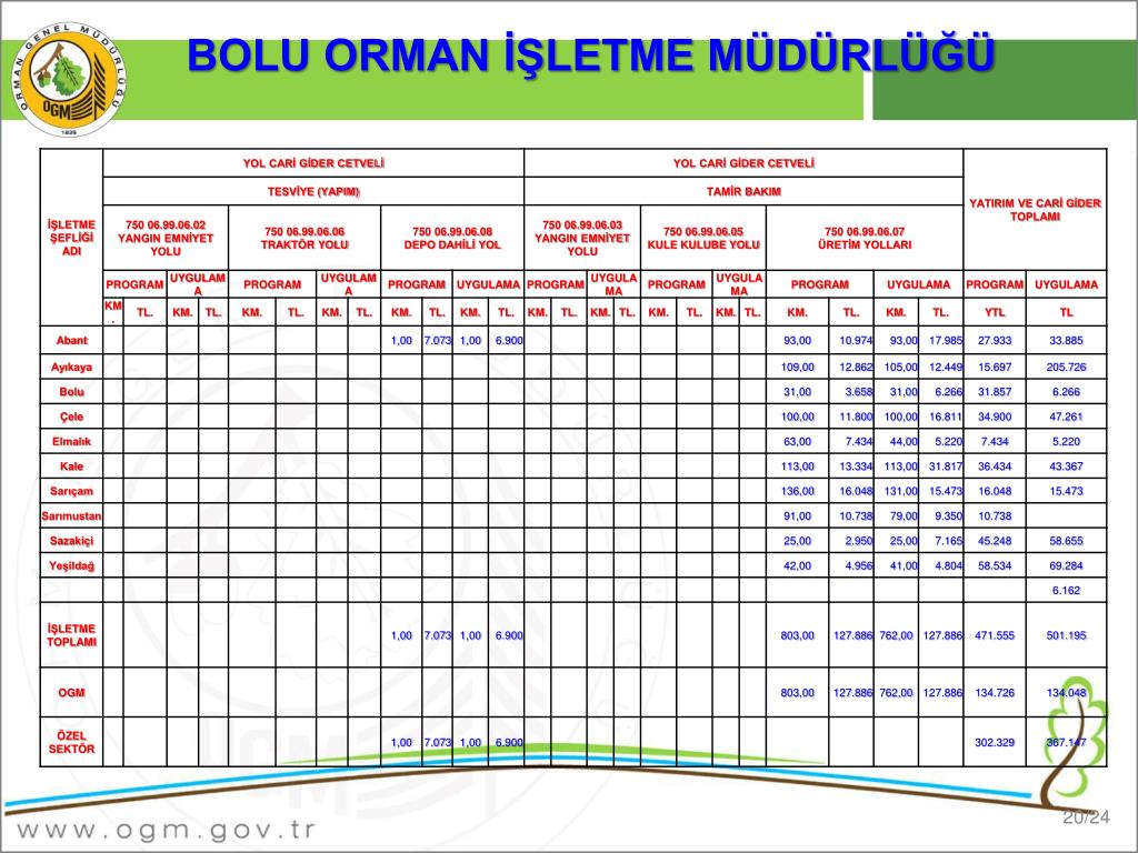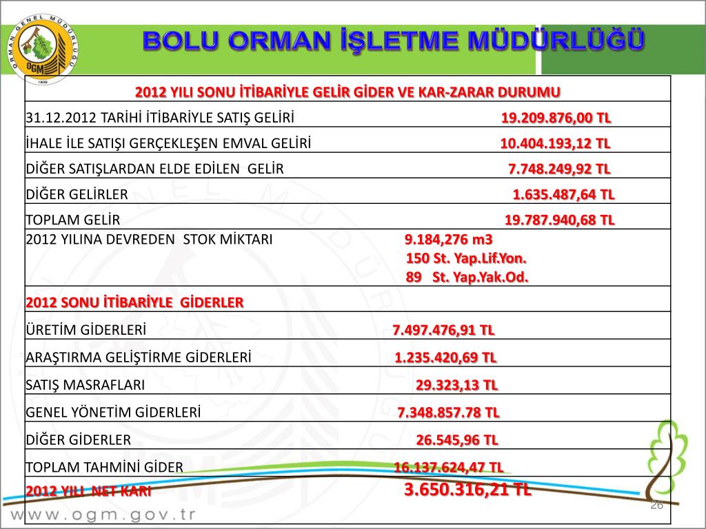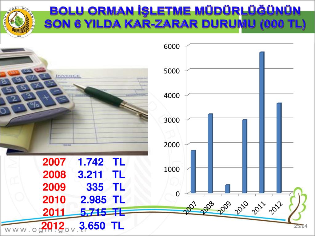 BOLU ORMAN İŞLETME MÜDÜRLÜĞÜNÜN SON 6 YILDA KAR-ZARAR DURUMU (000 TL) 2007 1.742 TL 2008 3.211 TL 2009 335 TL 2010 2.985 TL • 2011 5.715 TL 2012 3.650 TL