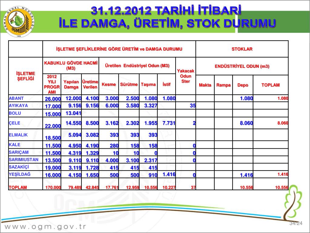 31.12.2012 TARİHİ İTİBARİ İLE DAMGA, ÜRETİM, STOK DURUMU