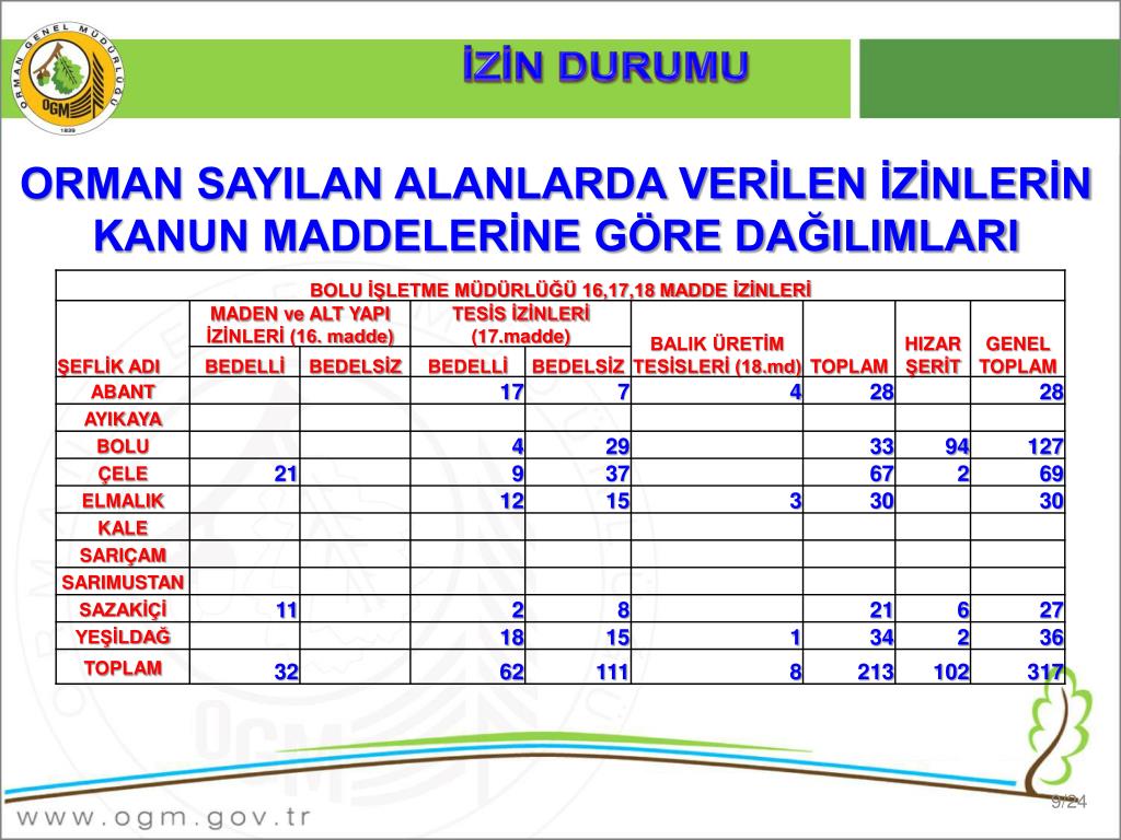 İZİN DURUMU ORMAN SAYILAN ALANLARDA VERİLEN İZİNLERİN KANUN MADDELERİNE GÖRE DAĞILIMLARI