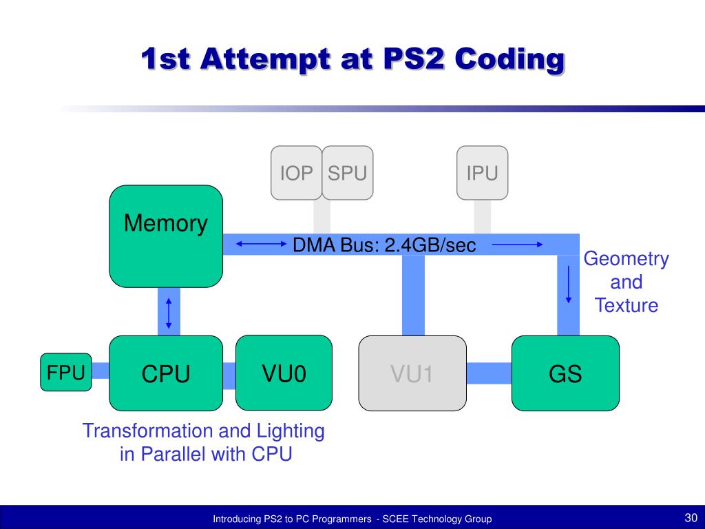 1st Attempt at PS2 Coding IOP SPU IPU Memory DMA Bus: 2.4GB/sec Geometry and Texture VU0 CPU VU1 GS FPU Transformation and Lighting in Parallel with CPU
