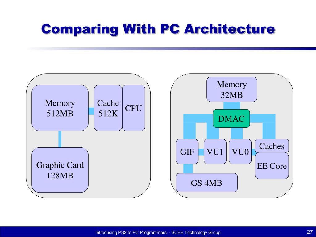 Comparing With PC Architecture Memory 32MB Memory 512MB Cache 512K CPU DMAC GIF VU1 VU0 Caches Graphic Card 128MB EE Core GS 4MB