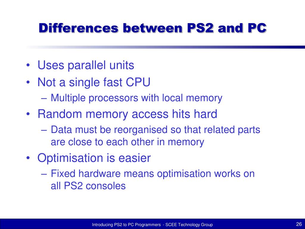 Differences between PS2 and PC • Uses parallel units • Not a single fast CPU • Multiple processors with local memory • Random memory access hits hard • Data must be reorganised so that related parts are close to each other in memory • Optimisation is easier • Fixed hardware means optimisation works on all PS2 consoles