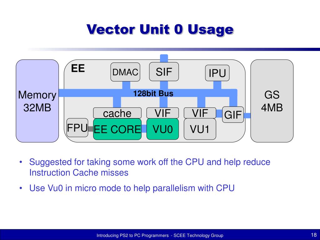 PS2 Architecture IOP: Input Output Processor SPU2: Sound Processor SPU2 IOP EE Memory 32MB GS 4MB SIF DMAC IPU 128bit Bus GIF cache VIF VIF FPU VU0 VU1 EE CORE EE: 128bit Emotion Engine GS: Graphic Synthesiser VU0/VU1: Vector Units DMA: Direct memory access FPU: Floating Point Unit IPU: Image processing Unit