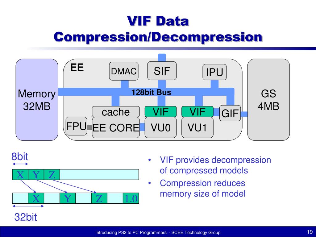 8bit X Y Z X Y Z 1.0 32bit VIF Data Compression/Decompression • VIF provides decompression of compressed models • Compression reduces memory size of model EE Memory 32MB GS 4MB SIF DMAC IPU 128bit Bus GIF cache VIF VIF FPU VU0 VU1 EE CORE