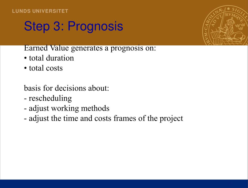 Step 3: Prognosis • Earned Value generates a prognosis on: • total duration • total costs • basis for decisions about: • - rescheduling • - adjust working methods • - adjust the time and costs frames of the project